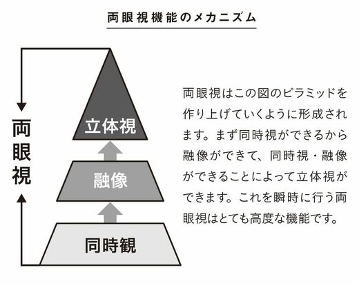 この機能は同時視、融像、立体視に分類されます。左右の目で捉えた情報を脳内で合わせることで、立体感のある映像として認識することができ、遠近感もつかめるわけです。