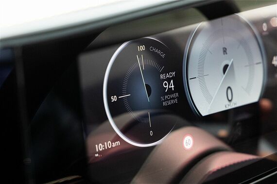 パワースイッチをオンにしてDレンジへ。駐車場から公道に出るまでは10km/h以下でしずしずと走らせてみる。わずか10km/hだがすでにこの時点で立派なロールス・ロイスであることが体感できた。パワーリザーブメーターはアクセルペダルを踏み込むと数値が100%から下がっていくが、こうしてスルリと走らせるには5%も必要としない。