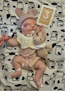 手術をして下まぶたを形成したものの眼球が剥き出しになっている部分があるため、一日数回の点眼と、夜眠るときには眼球に軟膏を塗ってラップで覆うケアが必要だ。嚥下障害があるので、よだれや痰は吸引し、食事は胃ろうから摂取する(現在、少しずつ口から食べることも練習中)。夜間は人工呼吸器で酸素を注入している。