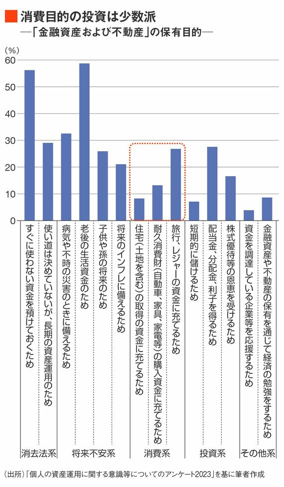 次点が「すぐに使わない資金を預けておくため」である。「耐久消費財の購入資金に充てるため」などの消費に直結する目的はかなり少数派であることがわかる。