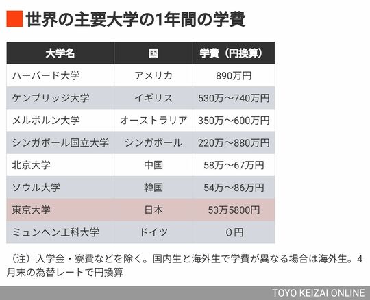 アメリカやイギリスでは、受益者負担の考えから優れた大学ほど学費が高くなっています。一方ドイツでは、大半の大学で学費はゼロです。他にも北欧諸国など学費ゼロの国があり、東京大学の53万5800円が世界最安値というわけではありません。ただ、昨今の円安の影響もあり、日本は世界だけでなくアジアの中でもかなり安い部類です。