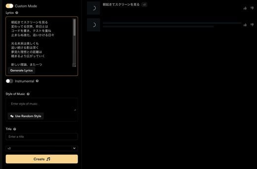 下の図は、実際にSunoに歌詞を入力して音楽を生成している様子です(ちなみにこの歌詞はChatGPTに考えてもらったもので、純AI音楽です)。GoogleアカウントなどでSunoのアカウントを作成し、「Create」ボタンから「Custom Mode」を選択して、歌詞を入力、そして「Create♫」ボタンを押してしばらくすると音楽が生成されます。
