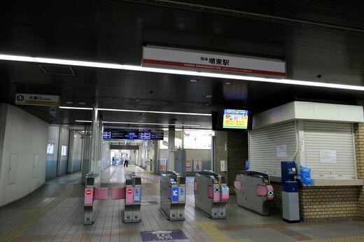 北東口はマンション「堺東ヴューモ」と直結。かつての検車区があった場所を再開発して2009年に誕生した。北側に長尾街道が通っており、東へ進むと方違(ほうちがい)神社。付近は摂津、河内、和泉の3つの国の境界があり、三国ヶ丘や堺の地名の由来となった。