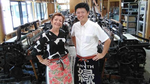 西村和弘社長は「前掛けは分厚く、素材も綿で丈夫なので、仕事着のイメージが強い。しかし海外の人の発想は自由で、高級フレンチのシェフが使っていたりする。デザイン性や品質のよさが海外の人から評価されている」と語る。
