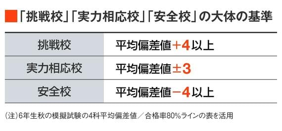先ほど、「挑戦校」「実力相応校」「安全校」という表現を用いたが、その大まかな基準を紹介したい。
