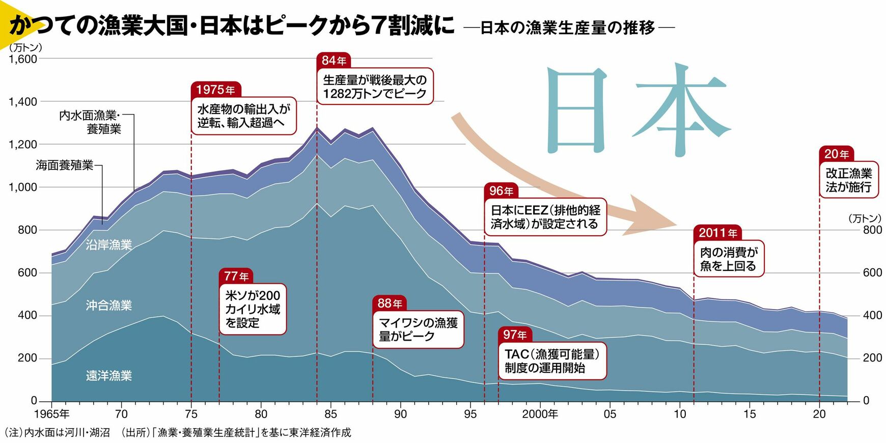 長期で見る限り、日本の漁業生産量は40年間近く、ずっと下がり続けてきた。ピークは1984年の1282万トン。その後は長く低落傾向を続け、2022年は391万トンである。ピーク時からは約7割もの大幅減だ。