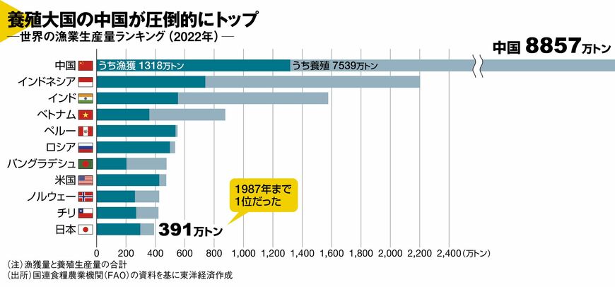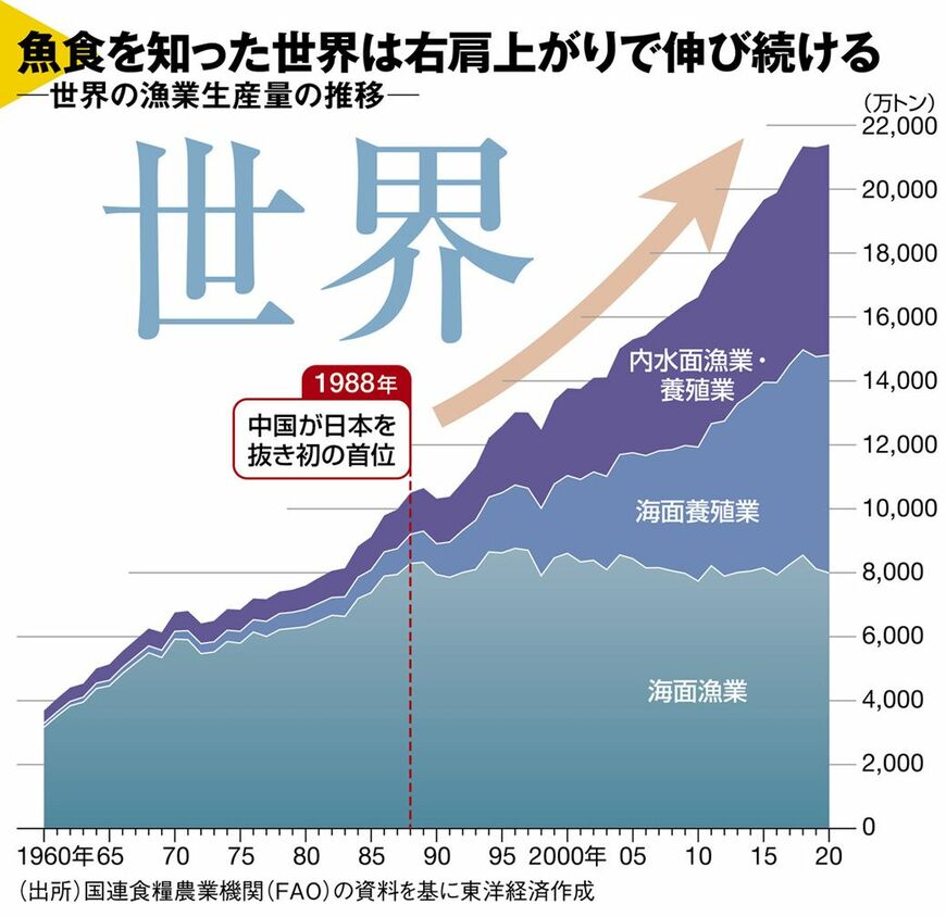 まずは遠洋・沖合漁業からの後退だ。かつて日本は「公海の自由」の原則の下、世界のどこにでも行き、好きなだけ魚を獲ってこられた。獲れなくなったら別な漁場へ行く。そんな漁業だった。ところが、米と旧ソ連(現ロシア)が1977年に200カイリ水域を設け、その後、世界の沿岸各国もEEZ(排他的経済水域)を設定。日本も大きく方針転換せざるをえず、遠洋漁業や沖合漁業からの後退を迫られたのである。