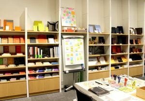 たとえば4階の「MEETING」。フロアの真ん中にはオフィス用デスクが島ひとつ分、どーんと置かれており、そこに筆記用具やノート類が無造作に並びます。また、付箋にアイデアを書いてはペタペタ貼っていく会議でおなじみの、ブレストの光景がホワイトボードに貼り出され、これがリアルさを際立たせています。壁面に並べられたこだわりノートやファイル類はきちんと色分けされ、好みのものを選びやすいのも特徴。オリジナルのノートを作ってくれるサービスもあります。