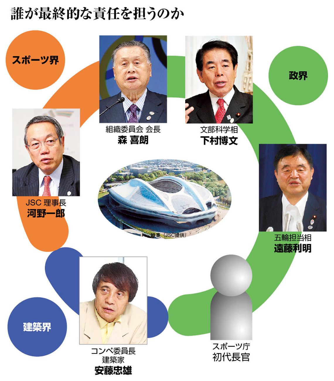 コンペの委員長としてザハ氏のデザインを選んだ後、沈黙を続ける安藤忠雄氏、コンペの主催者であり事業主体でもあるJSCの河野一郎理事長、その監督官庁である文科省の下村大臣、東京五輪・パラリンピック組織委員会の森喜朗会長、新たに五輪・パラリンピック担当相となった遠藤利明氏、そして秋には誰かが就任するスポーツ庁の初代長官。