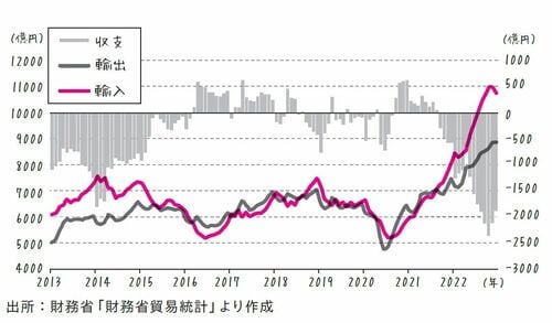 2013年以降の日本の貿易収支を表したグラフです。折れ線グラフが輸入と輸出を示しており、その差額が棒グラフです。ゼロより下になると赤字、ゼロより上になると黒字です。2013年から約5年程度は、貿易赤字が続き、そのあとは貿易黒字に移行しているのが見て取れます。