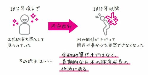 経済力が下がれば、その国の通貨の人気は下がり、通貨の価値も下がります。円安の流れが進んだのは「失われた30年間」に顕著になった日本経済の成長の低さも原因のひとつなのです。