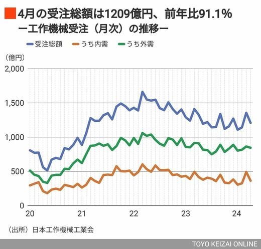 2024年4月の工作機械の受注総額は、1209.0億円。前月比でマイナス10.9%、前年同月比でマイナス8.9%という結果になった。16カ月連続で前年同月比割れになっているものの、2カ月連続で1200億円を超えた。四半期末月(3、6、9、12月)以外で1200億円を超えたのは1年ぶりだ。