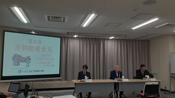 5月23日に開催された日本工作機械工業会(日工会)月例記者会見の模様。写真中央が稲葉善治会長、左が柚原一夫専務理事(記者撮影)
