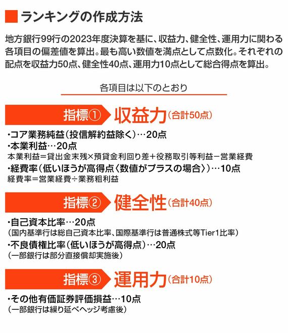 ランキングの作成方法は下記の通りだ。収益力、健全性、有価証券の運用力に関するデータを抽出し、点数化。総合得点の低い順に並べている。