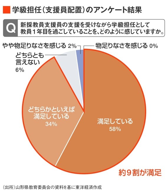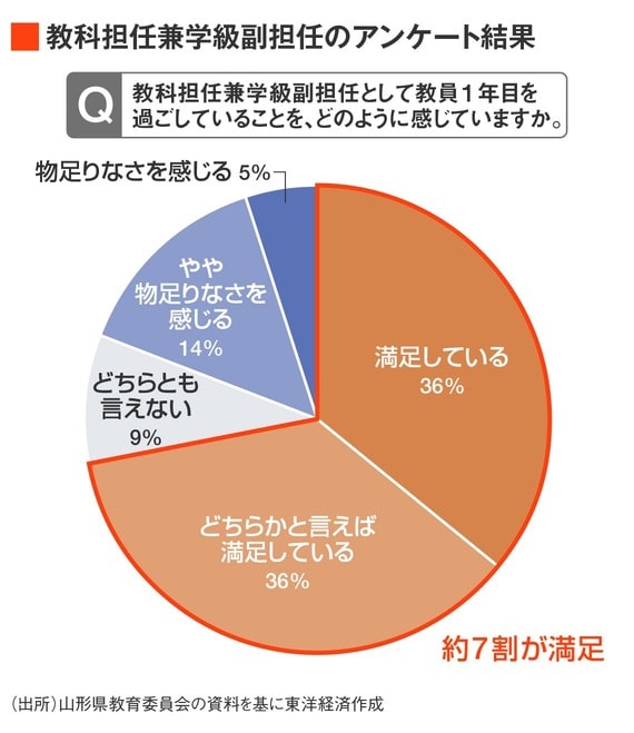 2023年11月に県教委が大卒新採教員と勤務校の校長に実施したアンケートでは、教科担任兼学級副担任の72.8%、学級担任(支援員配置)の91.4%が、この体制について「満足している」または「どちらかといえば満足している」と回答した。