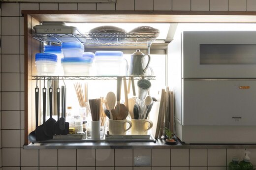 コックピットのように動きやすいキッチン。キッチンは作業効率アップのためオープン収納。よく使うツール類は、すぐ手が届くところにわかりやすく配置しています。無印良品のレードル(2)やスパチュラ(3)は吊るして、さっと取れるように(出所:『大人が選ぶ無印良品』)