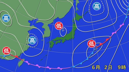 6月2日の時点で、梅雨前線は沖縄付近に伸びていて、本州からは離れています。