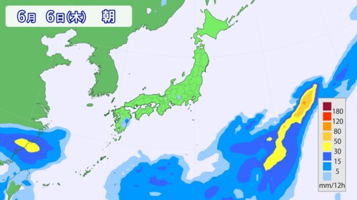 6月6日の雨雲の予想です。南の海上に見られるのが梅雨前線に伴う雨雲で、6月6日になっても、まだ梅雨前線は本州から離れている見込みです。