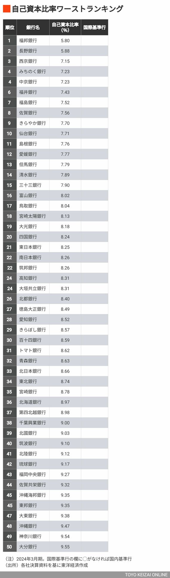 ビジネス #地銀決算ランキング2024 前の記事 次の記事 窮地の銀行も!地銀「自己資本比率」ランキング 「資本持ちすぎ」ならアクティビストの標的に 2分で読める 公開日時:2024/06/07 05:00 一井 純 東洋経済 記者 フォロー 北山 桂 東洋経済 記者 フォロー 1/5 PAGES 2/5 PAGES 次ページが続きます:【大手地銀は軒並み高水準】 3/5 PAGES 4/5 PAGES 5/5 PAGES