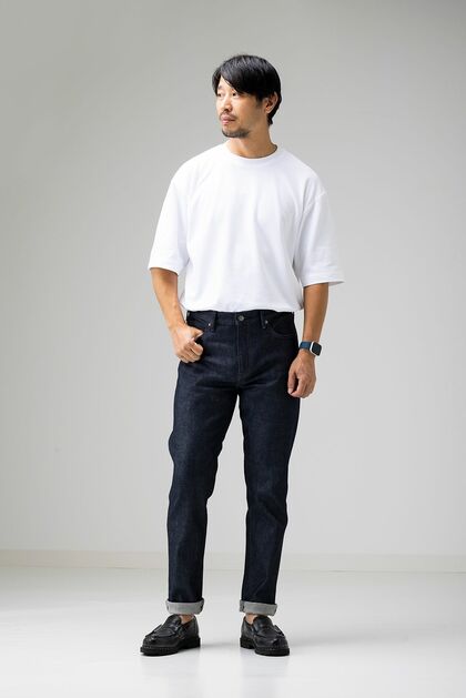 着こなすポイントは、Tシャツの裾をパンツに入れるタックインをすること。そうすればだらしなく見えず、スタイルアップがかなう。