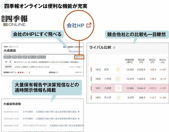 例えば大成建設のページにあるライバル比較の項目を見ると、競合する大手ゼネコンの鹿島、大林組、清水建設との株価や業績比較が載っていて役に立ちます。