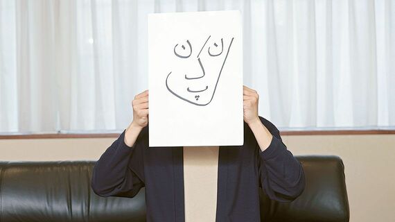 イラン当局からの特定を避けるため顔出しNGの条件で取材に応じた。紙に描かれたのはペルシャ語の「へのへのもへじ」(撮影:尾形文繁)