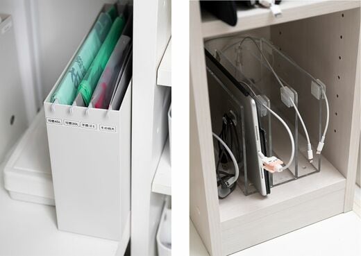 (写真左)無印良品のファイルボックス(5)にバーをかけて、ゴミ袋を分類。在庫管理もしやすく、ゴミ捨てのゆううつさが軽減されます。ファイルボックスは頑丈なので、ほかの場所でも活躍中