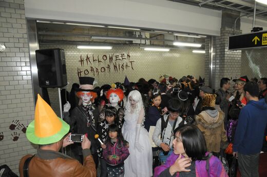 当日はホームのあちこちにおどろおどろしい装飾が施され、パフォーマーによるアトラクションなども開催。普段とはガラリと異なる雰囲気のホームに歓声、もとい悲鳴を上げていた。