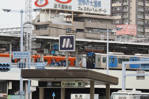 駅から地上に出ると、目の前に阪神の野田駅があるほか国道2号線が通る大きな交差点もあって、かなりにぎやかな雰囲気。駅前には阪神の本社などオフィスビルも多い一方、商店街もいくつかあり、終日にぎわっている。