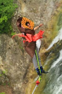 妻(32)が大声で叫んだあと、ひまわりの“人間ブーケ”に扮した夫(36)が急流に向かってバンジージャンプ。