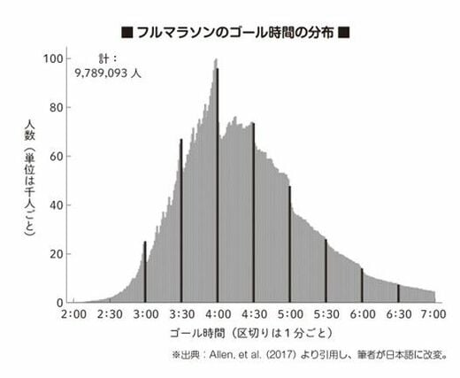 南カリフォルニア大学のアレンらの研究グループは世界中の累計約1000万人のフルマラソンの記録を集め、ヒストグラム(度数分布表)を作成しました[1]。