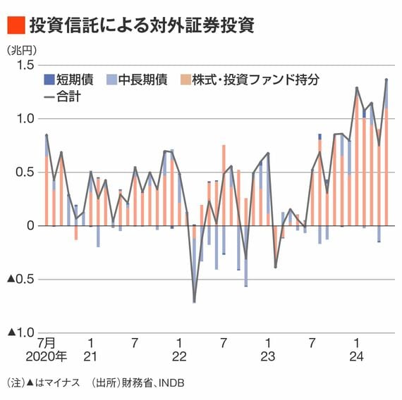 年初5カ月合計で投信経由の買い越し額は5兆6389億円に達しており、2023年通年(4兆5447億円)を超えたことになる。