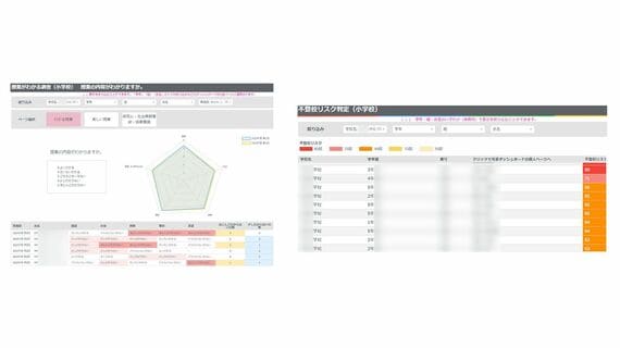 ダッシュボードは、3種類ある。出欠や保健室利用状況といった記録系情報のほか、テスト結果やアンケート回答などのデータが蓄積された「児童(生徒)ダッシュボード」、学級や学年、学校の単位で分析したデータが確認できる「学校×市平均ダッシュボード」、そして、不登校リスクスコアが示される「不登校リスク判定ダッシュボード」だ。