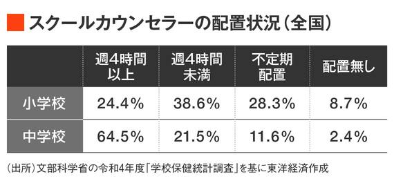 SC等活用事業では基盤となる配置時間を「週1回おおむね4時間程度」としているが、2022年度の調査によれば、SCが週4時間以上配置されている学校は、小学校では24.4%、中学校では64.5%にとどまる。さらに、小学校では8.7%、中学校では2.4%がSCの配置自体がない。