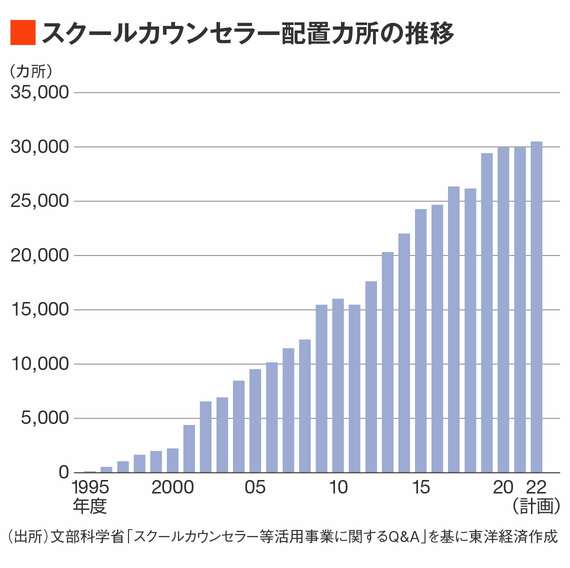 不登校やいじめなど心に関わる問題の増加を受け、1995年から始まった文部科学省のスクールカウンセラー(以下、SC)制度。当初は各都道府県に3名(小中高各1名ずつ)の配置だったが、段階的に拡充され、現在は約3万カ所にSCが配置されている。