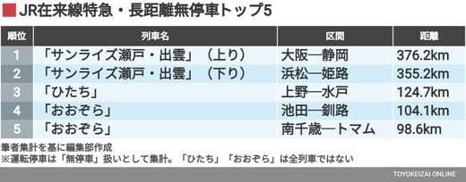 とはいえ、実際には運転士交代などで停車はしており、あくまで「ドアが開かず客の乗り降りができない」ということになる。ちなみに上り「サンライズ瀬戸・出雲」は、大阪を0時33分に発車すると、次の停車駅は4時38分着の静岡だ。こちらは距離にして376.2km、4時間7分となる。