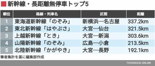 新幹線が長距離を高速で結んでいることがよくわかる。だが、ノンストップの距離は長いものの、スピードが速いだけに昔の特急のように何時間も停車しない、というわけではない。