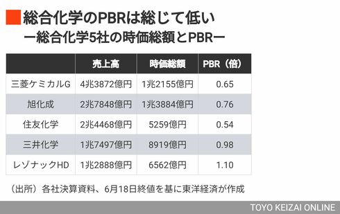 総合化学メーカーに対する株式市場の評価は低い。6月18日時点で大手5社の株価純資産倍率(PBR)を見ると、レゾナック・ホールディングスのほかは1倍割れ。旭化成も0.76倍しかない。