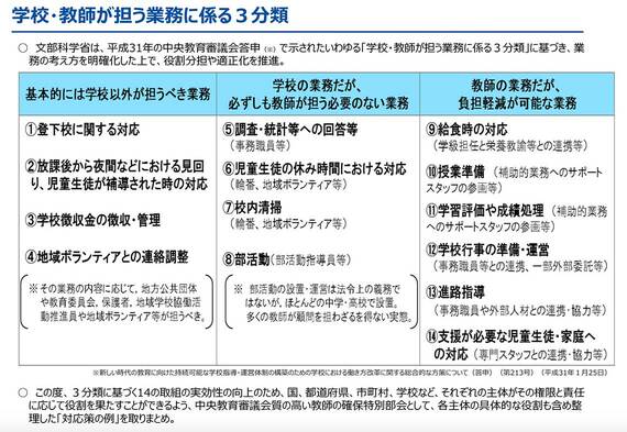 働き方改革の加速化では、2019年に出した中教審答申をベースに、学校・教員の業務の3分類をさらに推進することなどが明記されている。