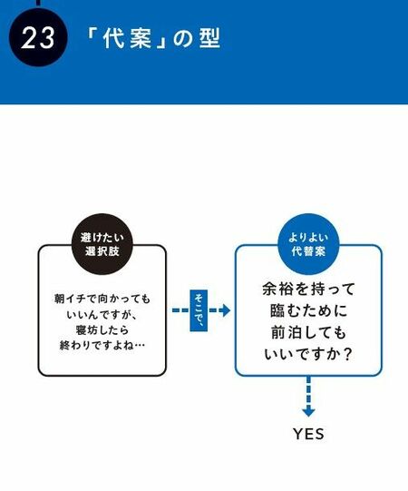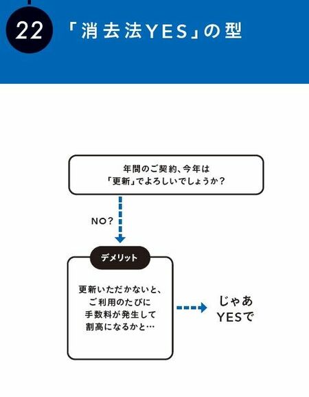 導入するメリットはなんとなく感じていそうだけど、悩まれているお店の方には、もしかすると【「消去法YES」の型】、【「代案」の型】が効果的かもしれません。この2つは、相手が気づいていないデメリットに気づかせることで、それを回避するためにYESを選んでもらう、という性質があります。