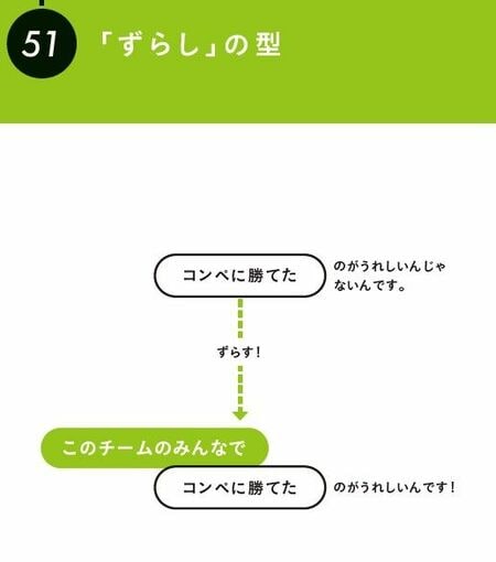 この型は、似たようなフレーズを並べて、その微差の部分に伝えたいことを込めるテクニックです。たとえば、
