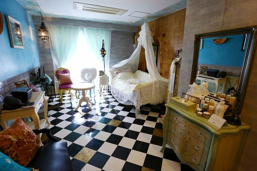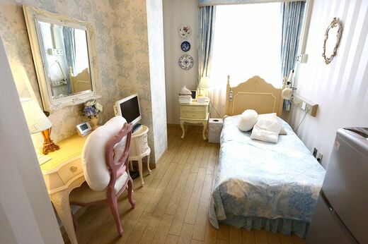 まずは最も豪華な特別室「フレンチモロカン」(1室、差額ベッド代1日3万5000円、税込み)。目のくらむようなチェック柄の床に、ターコイズブルーの壁。パリジェンヌをイメージした部屋にモロッコ風のテイストを取り入れた、非常に個性的な病室だ。ワンルームアパートほどの広さでこぢんまりとしている。
