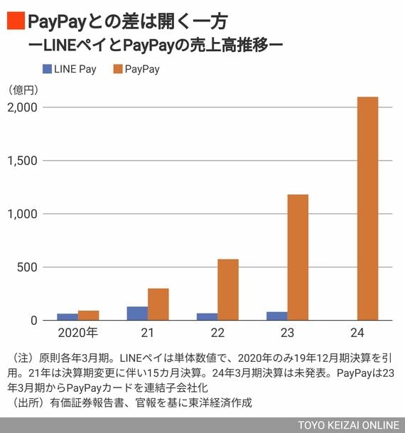 PayPayはLINEペイより4年遅い2018年10月にサービスを開始した。広告費や還元キャンペーンに巨額の資金を投じ、2年足らずでLINEペイの売上高を追い抜いた。その後も勢いは止まらず、2024年3月期にはカード子会社と合わせた連結売上高が2000億円を突破。足踏みが続くLINEペイとの差は広がる一方だった。
