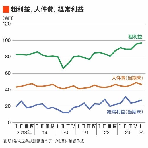 2022年1〜3月期から2024年1〜3月期までの2年間において、法人企業の粗利益は13.3%増加し、経常利益は20.1%増加した。しかし、人件費は7.3%しか増加しなかった。では、なぜ粗利益と経常利益が増大したのだろうか?