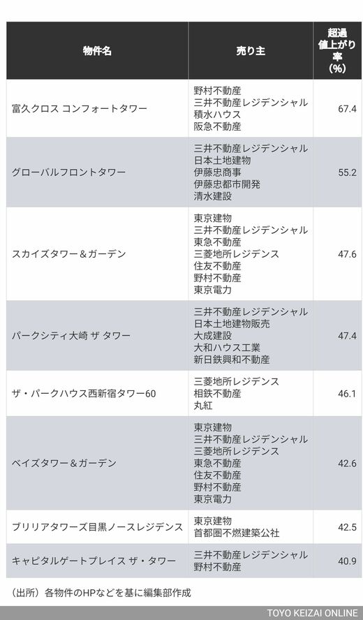これらの物件に連なる売り主はメジャー7(住友不動産、大京、東急不動産、東京建物、野村不動産、三井不動産レジデンシャル、三菱地所レジデンス)が多い。