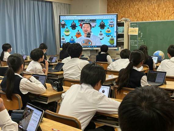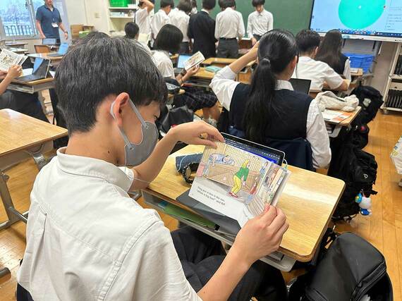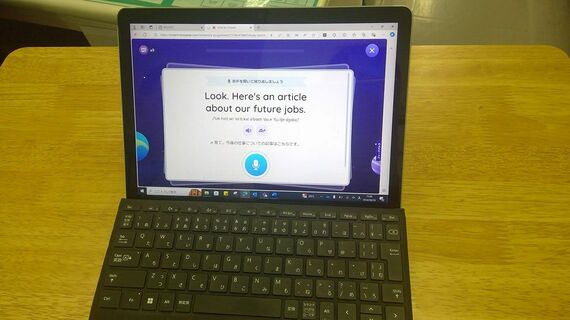 この学年は2クラスで、舞台芸術と英語の多読の授業が交互に行われています。取材時、舞台芸術の授業では、絵本を音で表現するという取り組みを行っていました。また、英語はAI英会話アプリ「ELSA」を使って、多読の授業が行われていました。