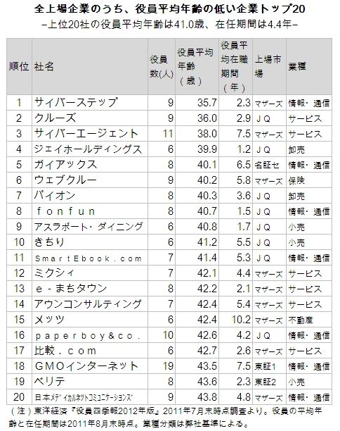 全上場企業のうち、役員平均年齢の低い会社を見ると、1位はオンラインゲーム開発大手、サイバーステップの35.7歳だ。3位にはインターネット広告、ゲームや交流サイトの運営などを行うサイバーエージェントの38.0歳などインターネットビジネス関連が目立つ(「全上場企業のうち、役員平均年齢の低い企業トップ20」参照)。