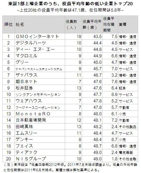東証1部上場企業に限ると、役員平均年齢が最も低いのは、レンタルサーバーなどウェブインフラ事業やネット広告を手がけるGMOインターネットの43.5歳だ。3位には携帯電話向けゲームや交流サイト主軸のディー・エヌ・エーが44.8歳、5位にも同業種のグリー45.0歳など、ここでもインターネットビジネス関連で成長を続ける企業が目立っている(「東証1部上場企業のうち、役員平均年齢の低い企業トップ20」参照)。