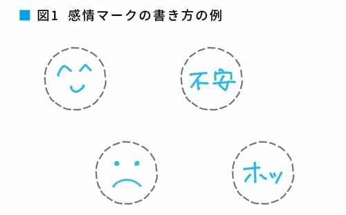 このように、「感情マーク」を描くことで、自分の感情を客観的に見るクセがついていきます。まるで自分の心の中にもう1人の自分がいて、冷静に観察しているようです。