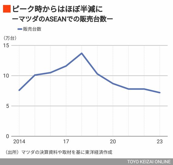 ASEAN全体としても厳しい。2023年度は7.7%減の7万2000台。他国が補ってタイ1国より減少率は小さく済んでいるが、2018年度の13万7000台からはほぼ半減の水準だ。